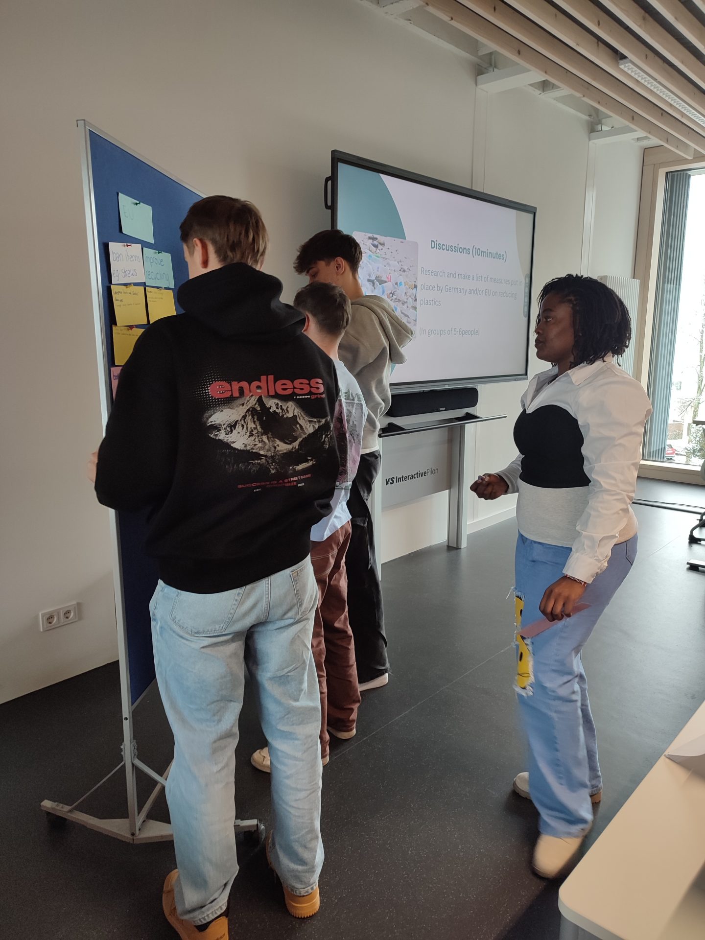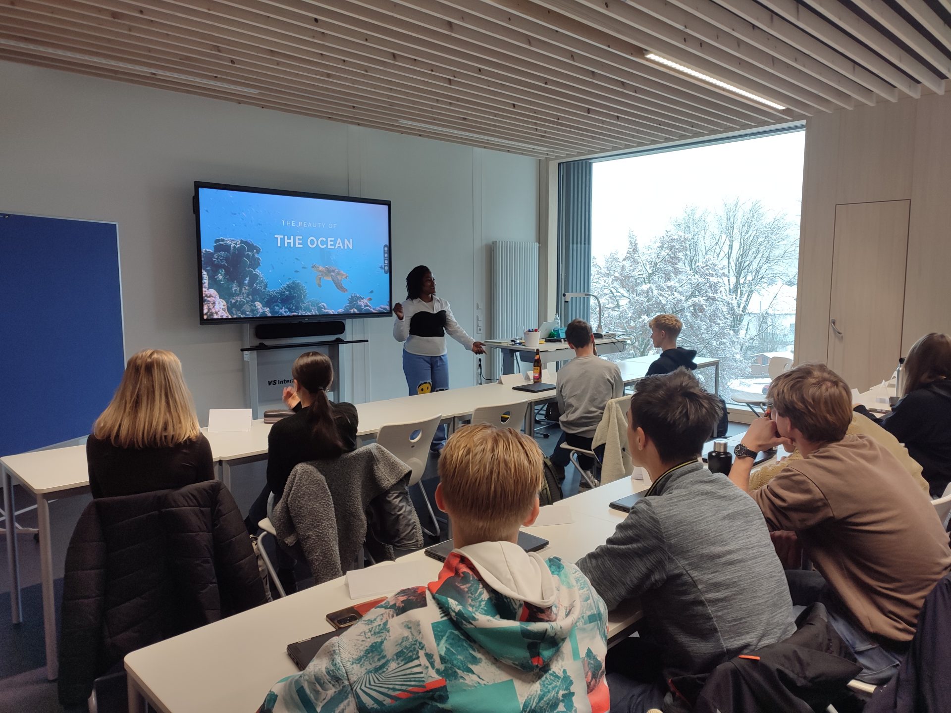 Diesmal durften die Schüler:innen ihre Bücher zu Hause lassen, denn die Klasse bekam Besuch von Fridah Khamalishi, Masterstudentin im Studiengang Environmental Governance an der Universität Freiburg und ursprünglich aus Kenia. Im Rahmen des Programms ‚Grenzenlos – Globales Lernen der beruflichen Bildung‘ des World University Service brachte sie den Schüler:innen das Thema plastic pollution näher und knüpfte dabei an das Nachhaltigkeitsziel Leben unter Wasser (SDG 14) der von den Vereinten Nationen verabschiedeten Agenda 2030 an.